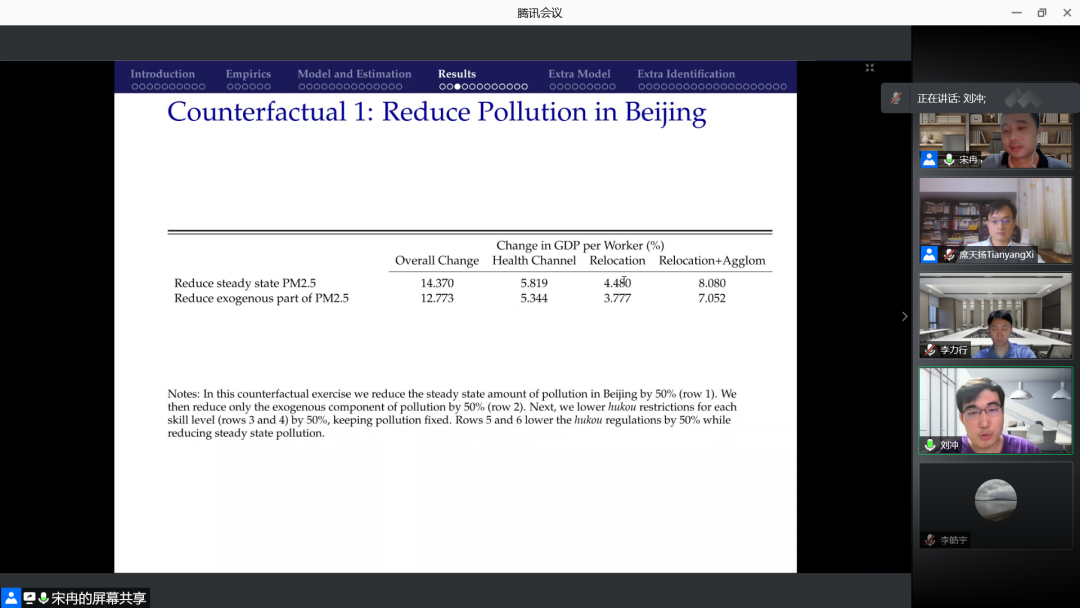 宋冉首先介绍了研究背景。几年前,中国东北和东部部分城市空气污染比较严重,使得部分高技能劳动力向污染较小的南方地区转移。他研究了污染引起的移民对中国城市生产力和福利的影响,污染使得高技能劳动者在低污染区域集聚,这导致了高技能劳动力资源的错配,影响了各城市的生产率和福利。